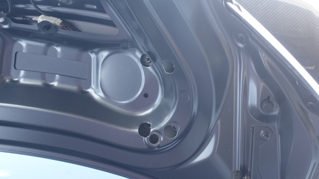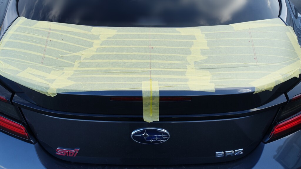 作業の流れとしてはお車に傷がつかないようにマスキングテープで養生をして、位置合わせ等を行い穴あけ加工をしていきGTウイングを取り付けていくという感じの作業になります。